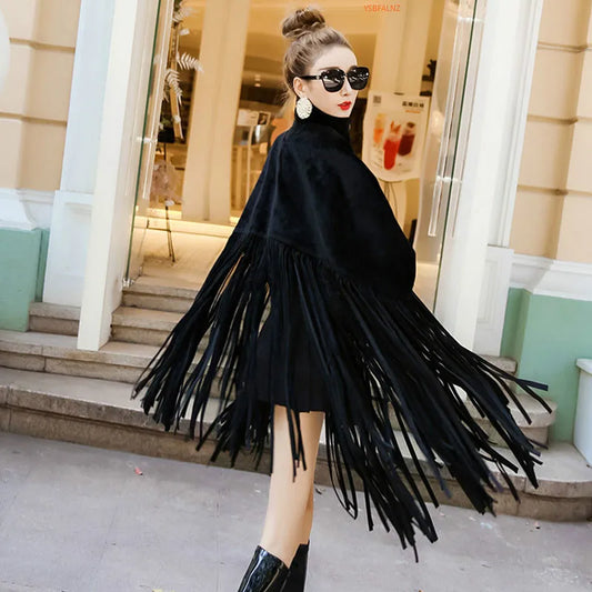 Autumn Black Jacket Loose Tassels Turtleneck Top