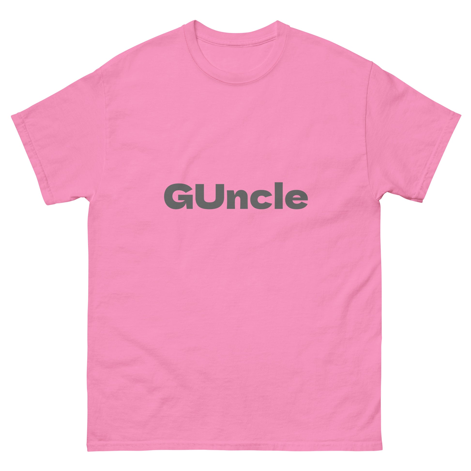 For the new and or proud GUncle. Wear it loud and proud! The 100% cotton men's classic tee will help you land a more structured look. It sits nicely, maintains sharp lines around the edges, and goes perfectly with layered streetwear outfits. Plus, it's extra trendy now!