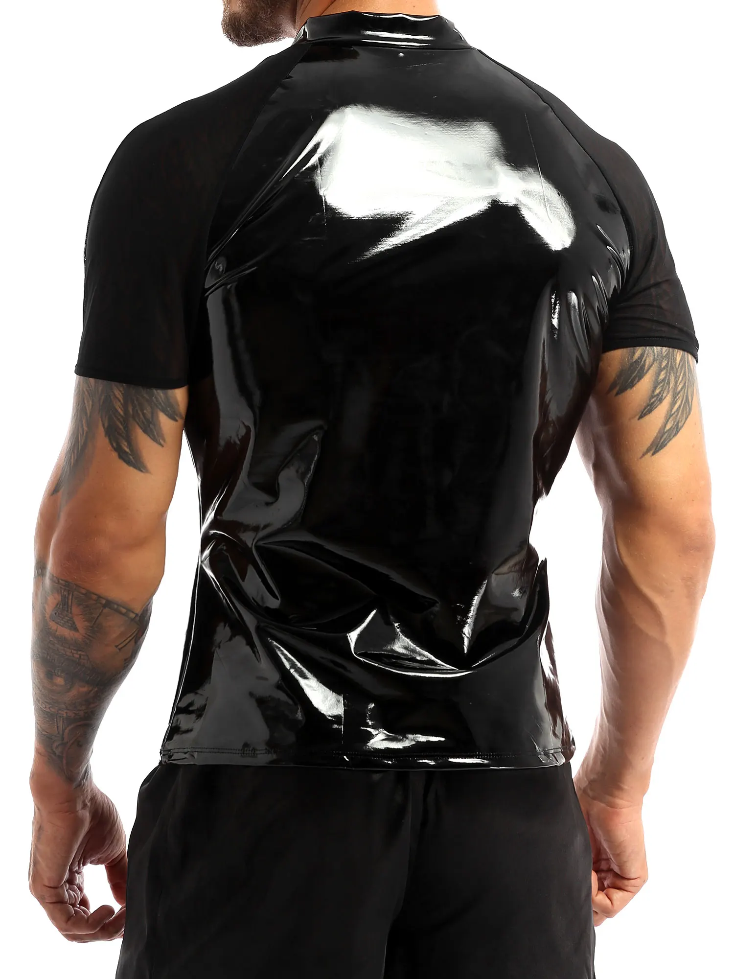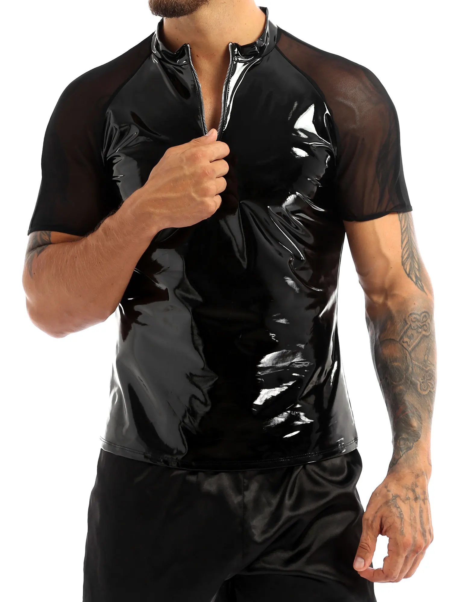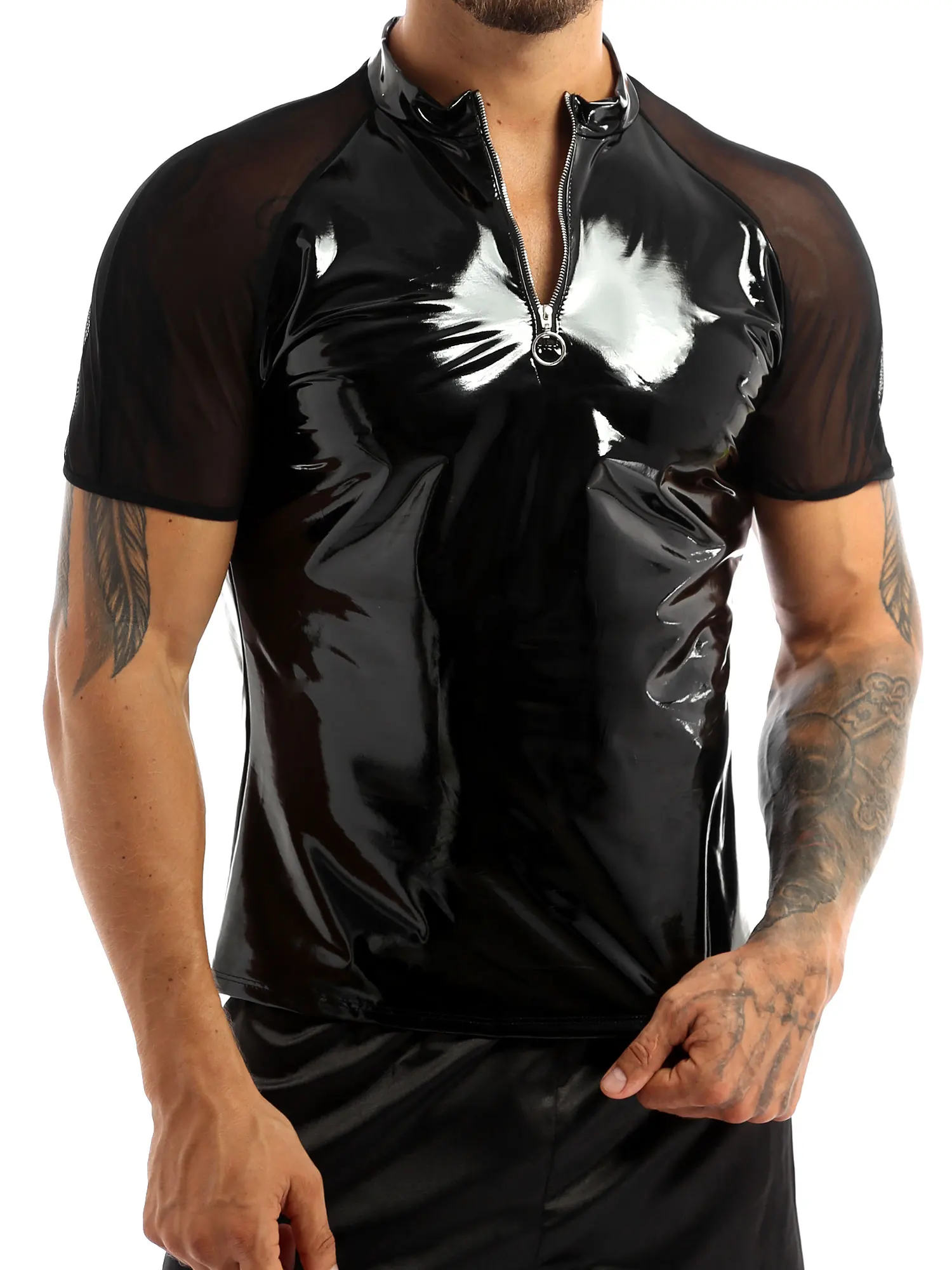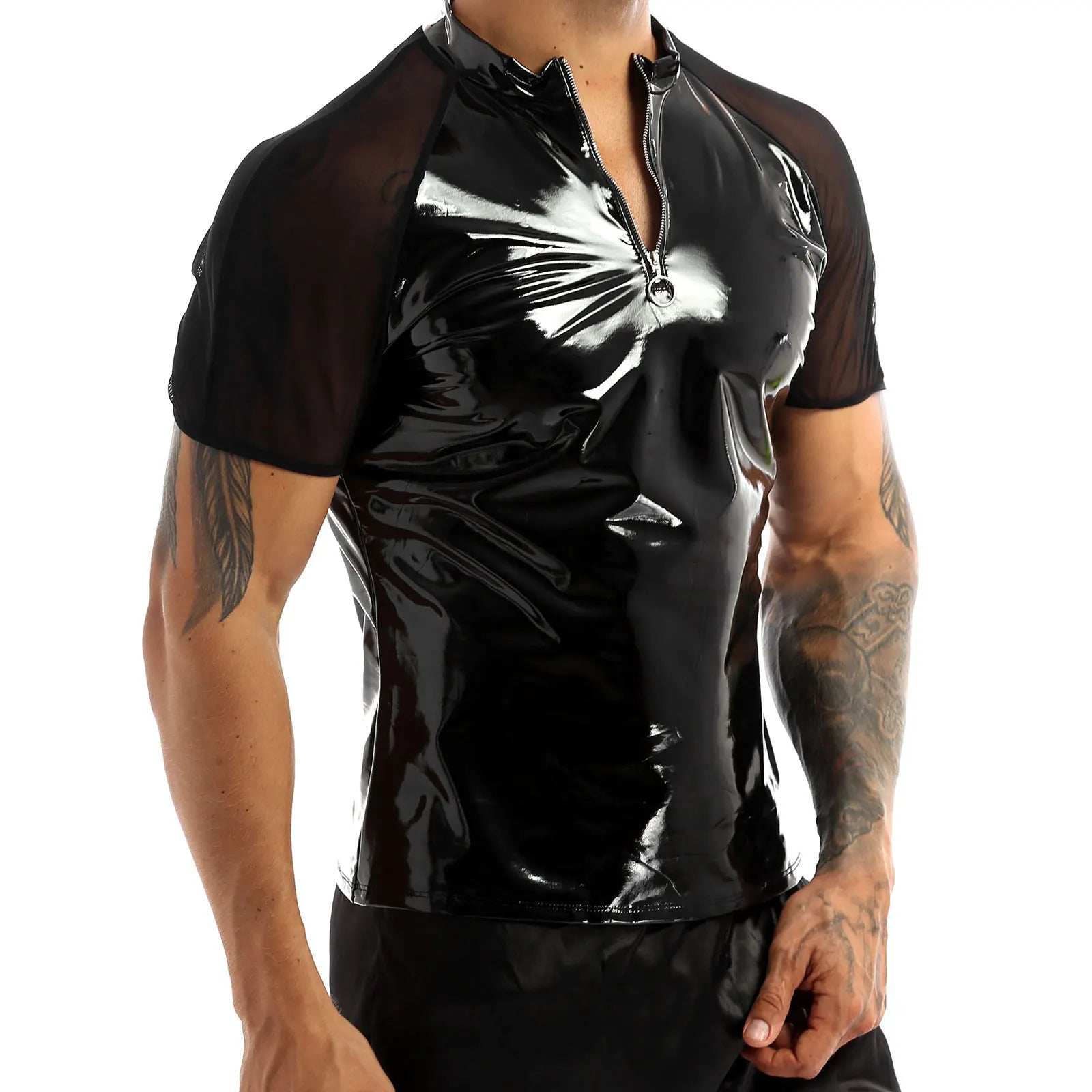 Men’s fashion wet look patent leather T-Shirts tops, very cool and seductive.