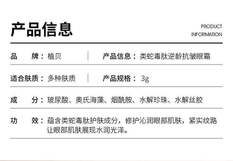 Efficacy: Contains snake venom-like peptide skin care ingredients, repairs and moisturizes the skin around the eyes, tightens the lines, and makes the skin around the eyes look hydrated and shiny.